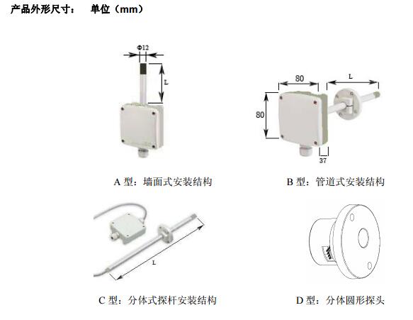 A,B,C 型安装结构:传感器探杆末端的窗口通道方向保持与被测的空气流动方向一致。