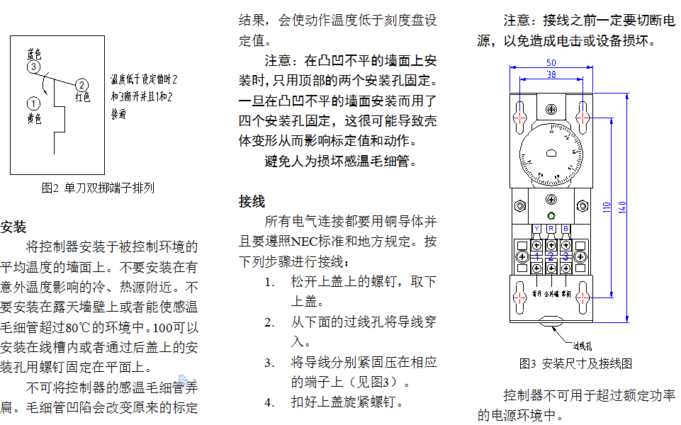 在凸凹不平的墙面上安装时,只用顶部的两个安装孔固定。一旦在凸凹不平的墙面安装而用了四个安装孔固定,这很可能导致壳体变形从而影响标定值和动作。
