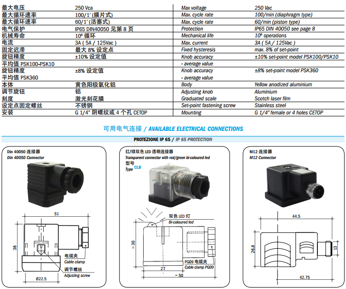 【PSK带刻度可调压力开关】详细技术参数